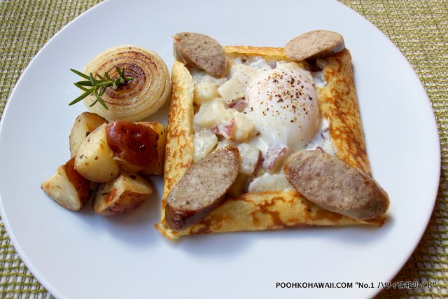 「ふわふわ卵サンドイッチ」($10.95) は、日本の厚焼き卵そのもの。ふわふわの卵焼きをパンに挟んでおり、シンプルな朝食を食べたい方におすすめ。ハワイの料理に疲れた方は、胃に負担のかからないこちらの一品をおすすめします。アルフレッドソースとセナペソースをつけてお召し上がりください。