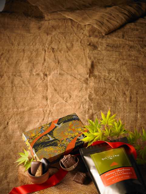 ミルクチョコレートで覆ったトフィーにセサミ、醤油、ガーリック、そして胡椒を軽くまぶした香味