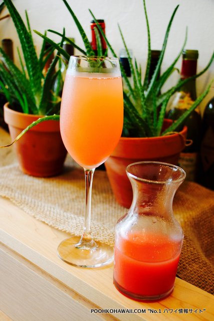 数回取材しているカピオラニ通りの「ブレッド+バター」。この度、新たにミモザブランチが登場しました。ミモザ-シャンパンがベースのカクテルで、オレンジジュースなどを足して飲みます。ハワイでは、グアバジュースなどがよく使われます。