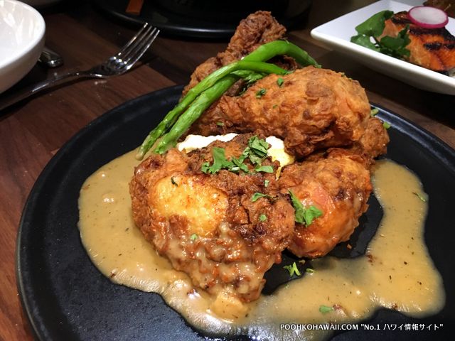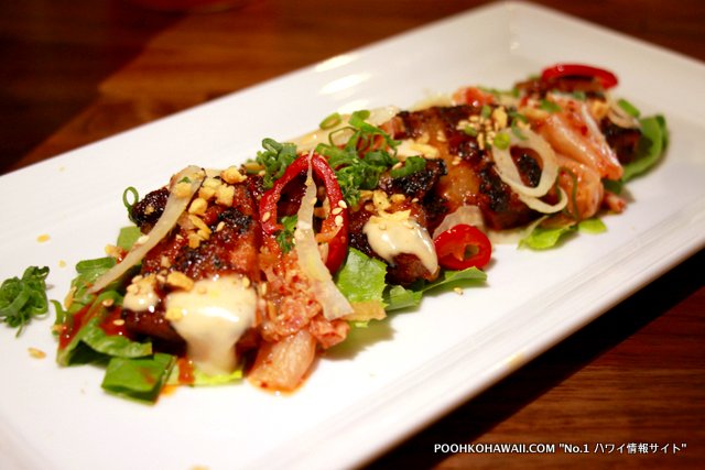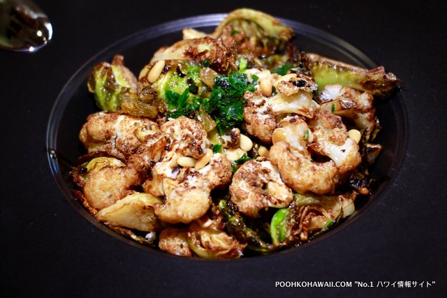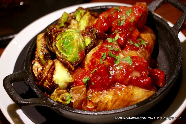 メニューの多くを食べてきました。1回目はどれも美味しかったのが特徴。特に「クリスピー・フライド・カリフラワー&ブリュッセル・スプラウツ」($15)、「”フリフリ”キムチ・ポークベリー」($17)は味がしっかりしており、おすすめ。メイン料理では、「ハワイランチャーズ・ビーフ・ロコモコ」($23) が予想を上回る美味しさ。今までハワイで食べたロコモコで一番かも、という意見が相次ぎました。肉の焼き方、醤油ベースのグレービーが最高に美味しさを引き出しています。ライスはカルアポーク入り。