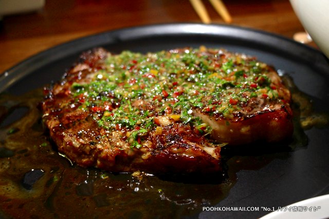 また、肉好きの方には「キワベ・スモークド・ハワイランチャーズ・ビーフリブアイ」($42) が一押し。上にかかっているチミチュリが、お肉に合う!肉は大変ジューシーです。