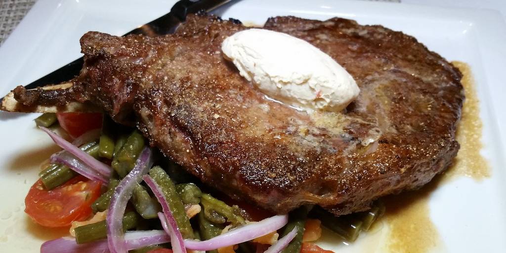 メインはこちら、「シアード・ボーンイン・リブアイ」($36) は、16オンスのリブアイを、カフィアライム(コブミカン)とライスのシーズニング、そしてレモングラスで味付け。シンプルですが、これは美味しい。肉好きにはたまりません!