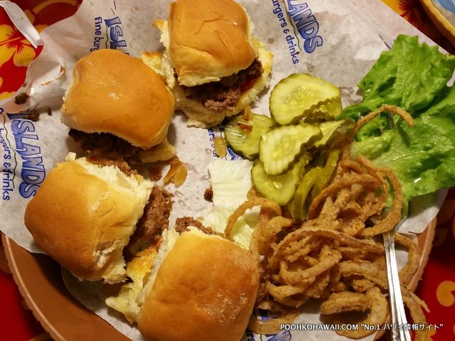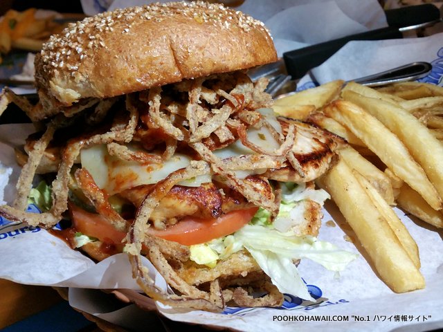 この日に食べたのがこちら。ボリューミーなハンバーガーの「マウイ・バーガー」 – グアカモレとベーコンが挟まれています。とても1人では食べきれませんので、みんなでシェアしました。