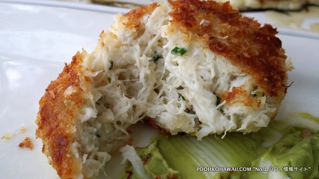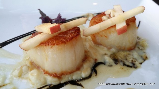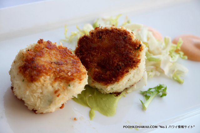 さらに3つのアペタイザーをいただきました。プリプリのホタテ(scallop) は食感が良く、下のコーンクリームをつけて召し上がってください。アスパラガスの天ぷらは、下に引いてあるパルメザンチーズとソースとの組み合わせがGOOD! 天ぷらは見た目ほどヘビーではありません。またクラブケーキは、中に蟹足がみっしりと詰まった贅沢品です。