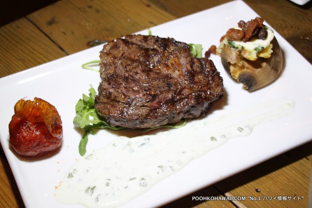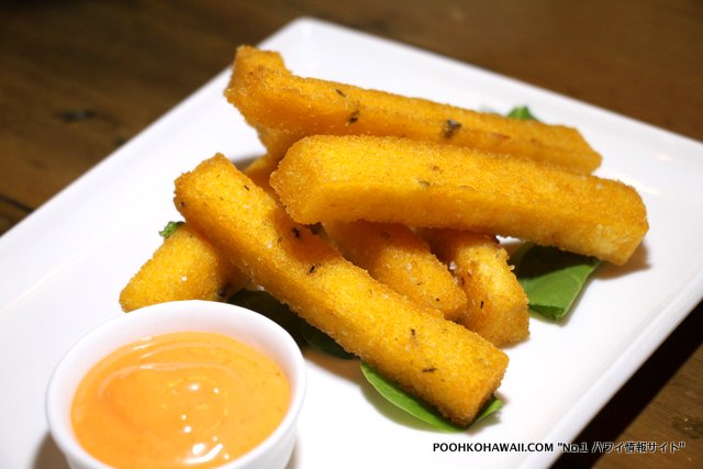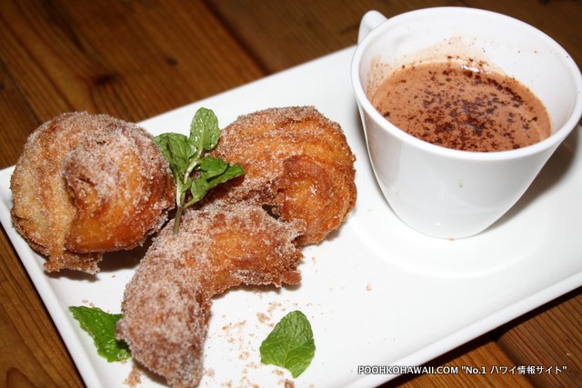 特に美味しかったのは、「ポレンタフライ」、「ハワイアン・チョッピーノ」、「グリルド・リブアイ」、そしてデザートの「餅チョロス」。トウモロコシ粥をフラにしたポレンタフライは、クリスピーで味はブルーチーズ&バルサミック、そしてホットソース・アイオリの2種類あります。香ばしくて後を引く味。リブアイは、フードブロガー全員が絶叫した一品。柔らかくジューシー、そのままでも十分美味しいですが、一緒につけて食べるワサビフレーシュがまた肉を引き立ててくれます。これは一押し!さらにデザートの餅チョロスは、見かけはドスっとしていますが(笑)、餅を使っているため食感がモチモチしており、これもまたハマります。チョコレートソースにつけていただきます。