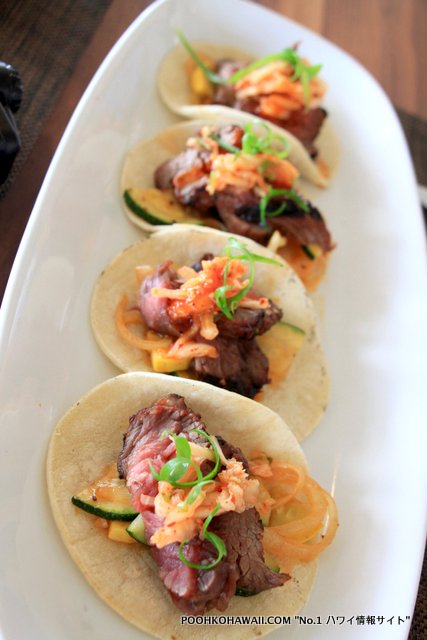 こちらの「コリアンタコス」($10) は、韓国料理でおなじみのカルビやキムチをトルティーヤで包んだもの。メキシカンのタコスを一捻りして、こんなに美味しいタコスが!というみんなの反応。おすすめです。