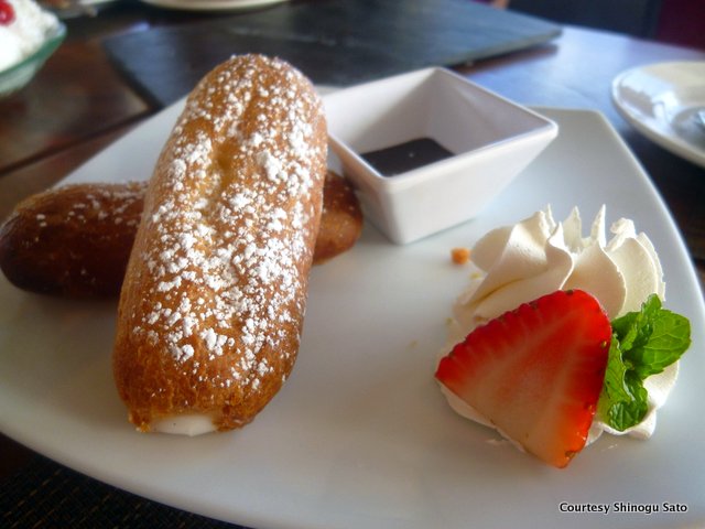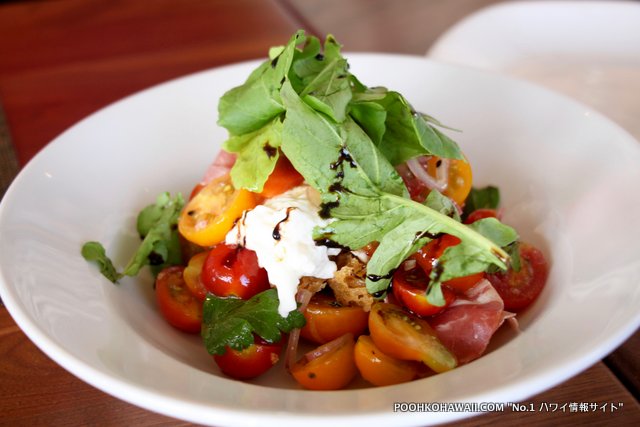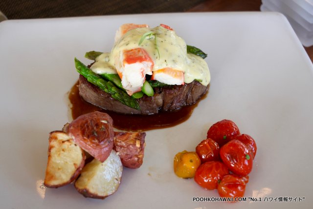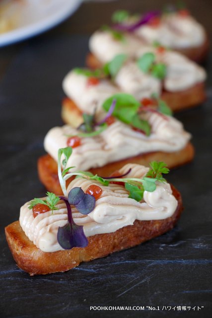 実は私自身、先月体調を崩し、あまり濃い目のものを食べられない・食べたくない状態でした。この日もそういう状況。こちらの料理は「フォアグラ・ブリオッシュ」($16)。フォアグラは通常脂っこい、というかヘビー。だから避けようと思っていました。しかし周りのメディアが食べている感想を聞くと、それほど重くはない、と。ではプーコハワイとしてはやはり食べないわけにはいかない、ということで、一口食べてみると… うん?軽い? とってもクリーミーでライト。口当たりも良く、普通の生クリームのようなものを食べている感じ。これは美味しい!アントレー前にみんなでどうぞ。