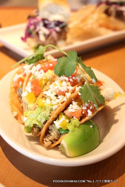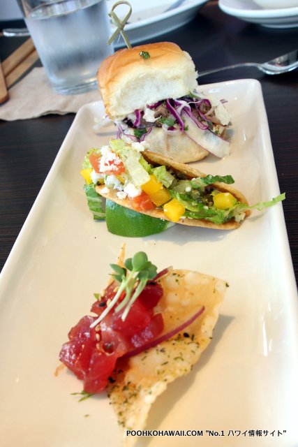 最後に3Fのレストラン「ルシェロ」でランチ。「アラ・サットン」エグゼクティブシェフによる美味しいお料理の数々。今回は、まとめて6種類ほど食べさせていただきました。素材はなるべくハワイ地産のものを使い、サステーナビリティをサポート。シンプルでいながら、味がしっかりしており、グルメ家も大満足。タコスやスライダーの中身であるチキンやカルアポークが大変香ばしく、お腹がいっぱいながらもすべて平らげました。